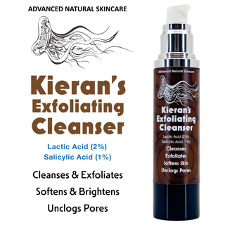 - Use 3-5 pumps of Kieran’s Cleanser on DRY or DAMP skin for 15-60 seconds, then rinse. It's laced with powerhouse exfoliators, salicylic acid (1%) and glycolic acid (2%). These natural acids seep down into your skin and break up crusty sebum, dead skin cells and keratin plugs that are clogging your pores and trapping toxins and bacteria. Then the powerful saponins, astringents and healing compounds that are extracted from organic roots, herbs and barks, get into that freshly mowed skin and suck more crud off your face than a romance movie from the 80’s.
